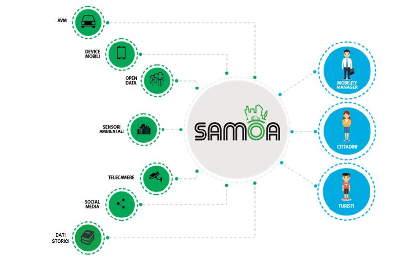 SAMOA è un sistema sperimentale che sfrutta l’ubiquità delle tecnologie del web 2.0 e la maturità delle tecnologie IoT (Internet of Things), Big Data e Computer Vision per migliorare i servizi di mobilità urbana in un’ottica di sostenibilità ambientale e di qualità della vita in città.